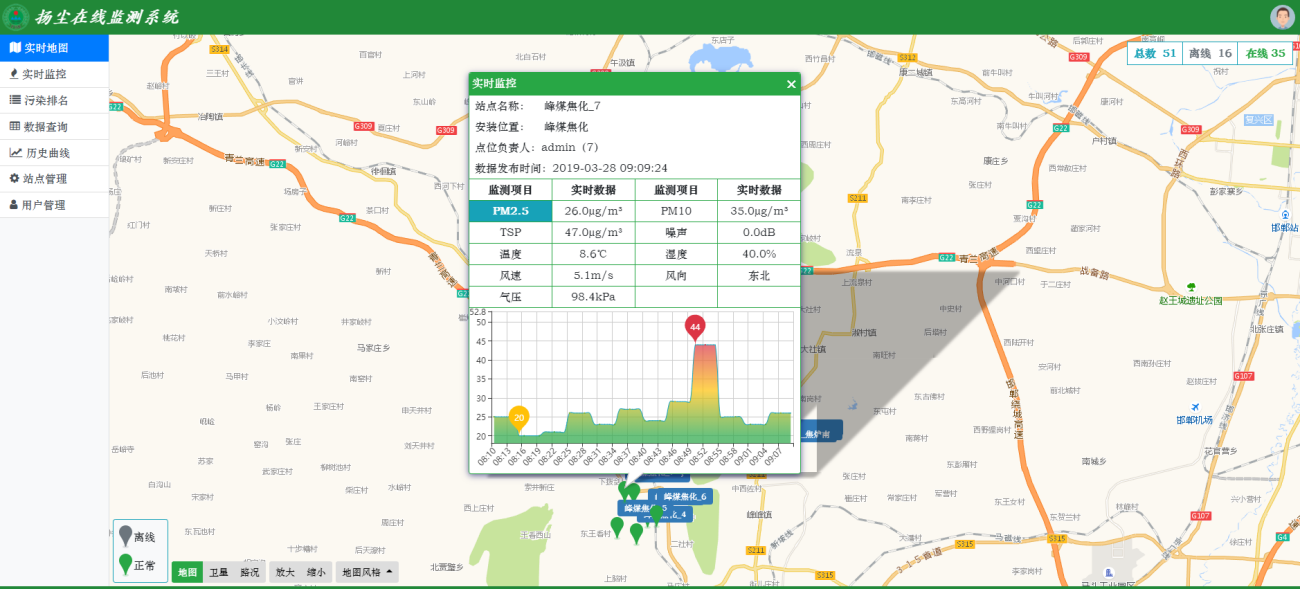 實時地圖展示:揚塵在線監測系統內所有監測點位按所屬行政區域進行歸類和展示,電子地圖確切的知道每個設備所在位置,通過點擊電子地圖上的設備圖標就可以查看設備所帶各項傳感器采集的實時監測因子,方便用戶直觀查看區域內所有監測點的部署情況和環境質量狀況。