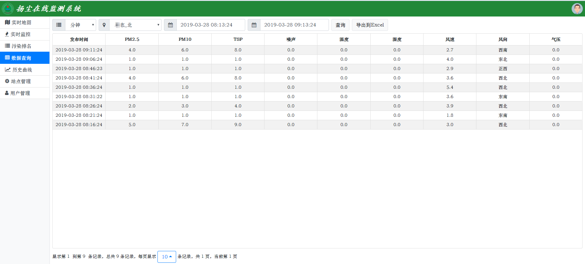 歷史數據查詢:系統提供歷史數據查詢功能,用戶通過設置時間類型、站點、查詢時間選項后,即可查看到所選擇站點的歷史數據信息,包括各項監測因子、數據更新時間等,查詢結果支持選用EXCEL文檔形式導出。