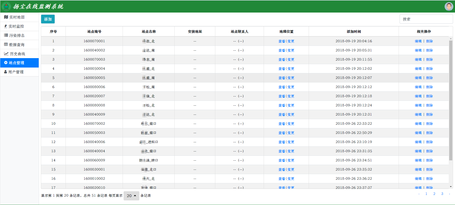 站點管理:用戶在此模塊可以實現監測點位信息的增、改、查、刪等基本操作,點位信息包括監測點位名稱、地址、經緯度、站點ID、所在區域名稱等內容,實現點位信息的動態管理,區域與編號為鎖定狀態,可自行配置名稱、經緯度、排名、公開、掉線預警等選項。